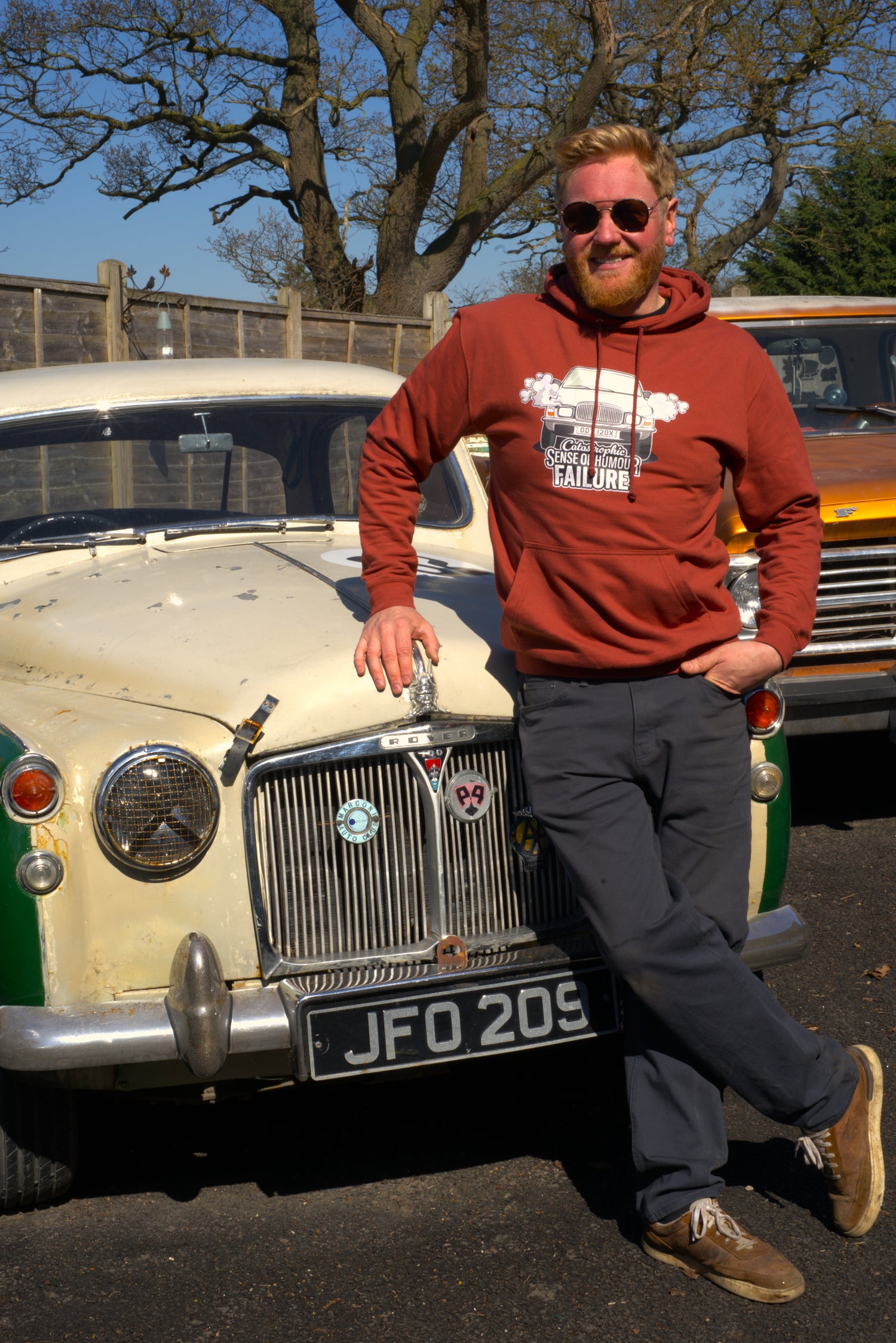 This Catastrophic Sense of Humor Failure hoodie features the steaming Vanden Plas on the front and the Tasty Classics logo on the back, giving it a sleek, understated look that’s perfect for everyday wear. Whether you’re under a car or relaxing, this hoodie delivers comfort with a touch of classic car failure.
